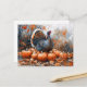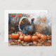 Aquarellmalerei eines Truthahns, der stolz zwischen Kürbissen und gefallenen Herbstblättern stehend ist.