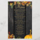 Herbst florale Botanicals und rostiger orangefarbener Kürbis über einem dunklen Stallholz mit Saitenleuchten Geburtstagsmenüvorlage.
