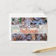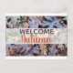 Willkommen Herbstpostkarte mit einem wunderschönen Bild gefallener Blätter mit winzigen gelben Pilzen.