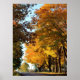"Country Colors in Herbst" Poster ist ein friedliches Bild von hellen Blättern auf den hohen Ahornbäumen auf einer Landstraße an einem schönen sonnigen Tag.