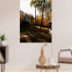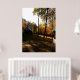 Ein Poster, das perfekt für den Herbst ist. Schauen Sie sich die Herbstfarben und das Sonnenlicht an, die durch die Bäume in dieser ländlichen Landschaft strahlen.