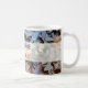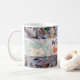 Diese Tasse zeigt ein wunderschönes Bild gefallener Blätter mit winzigen gelben Pilzen. Die anpassbare Beschriftung, in braun und orange Schriftart, lautet Willkommensherbst