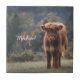 Herbstgras-Foto des Hochlandkalbs. Atemberaubendes junges Kalb von hochschottischen Rindern auf einem Herbstgrasfeld mit abgestuften Farben. Schöner, dunkelhaariger Orangenmantel kontrastiert mit hellgelb grünem Gras und Bäumen im Hintergrund. Individuell personalisierbares Monogramm mit Ihrem Namen und Ihrer Initiale auf dem verlassen.