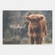 Herbstgras-Foto des Hochlandkalbs. Atemberaubendes junges Kalb von hochschottischen Rindern auf einem Herbstgrasfeld mit abgestuften Farben. Schöner, dunkelhaariger Orangenmantel kontrastiert mit hellgelb grünem Gras und Bäumen im Hintergrund. Individuell personalisierbares Monogramm mit Ihrem Namen und Ihrer Initiale auf dem verlassen.