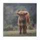 Herbstgras-Foto des Hochlandkalbs. Atemberaubendes junges Kalb von hochschottischen Rindern auf einem Herbstgrasfeld mit gedämpften Farben. Schöner, dunkelhaariger Orangenmantel kontrastiert mit hellgelb grünem Gras und Bäumen im Hintergrund.