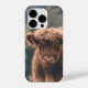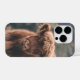 Herbstgras-Foto des Hochlandkalbs. Atemberaubendes junges Kalb von hochschottischen Rindern auf einem Herbstgrasfeld mit gedämpften Farben. Schöner, dunkelhaariger Orangenmantel kontrastiert mit hellgelb grünem Gras und Bäumen im Hintergrund.