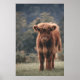 Herbstgras-Foto des Hochlandkalbs. Atemberaubendes junges Kalb von hochschottischen Rindern auf einem Herbstgrasfeld mit gedämpften Farben. Schöner, dunkelhaariger Orangenmantel kontrastiert mit hellgelb grünem Gras und Bäumen im Hintergrund.