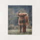 Herbstgras-Foto des Hochlandkalbs. Atemberaubendes junges Kalb von hochschottischen Rindern auf einem Herbstgrasfeld mit gedämpften Farben. Schöner, dunkelhaariger Orangenmantel kontrastiert mit hellgelb grünem Gras und Bäumen im Hintergrund.