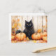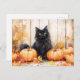 Aquarellmalerei einer flauschigen schwarzen Katze mit hellen, bernsteinfarbenen Augen zwischen Kürbissen und verstreuten Herbstblättern.