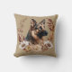 Ein schönes Portrait eines majestätischen deutschen Schäferhundes wird im Zentrum eines Herbstkranzes in den Farben Zimtbraun, Bräune und Sahne platziert. Der Hund und der Kranz sind auf einem hellbraunen Hintergrund angeordnet. Beide Seiten des Kissens haben das gleiche Bild, aber die Rückseite hat einen dunkelbraunen Hintergrund.