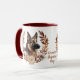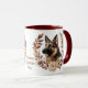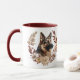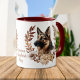 Ein hübscher Herbstkranz in den Farben Zimtbraun, Bräune und Creme umgibt das Bild eines deutschen Schäferhundes. Das Bild wird zweimal auf der Tasse gedruckt, wobei der eigene Text dazwischen liegt. Sie können den Text einfach durch Ihren Namen ersetzen, wenn Sie es vorziehen.