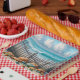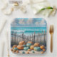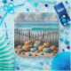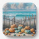 Eine Sammlung von orangen und türkisfarbenen Kürbissen an einem Sandstrand, der von einem verwitterten Holzzaun gerahmt ist