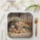 Eine bezaubernde Herbstszene mit einer Reihe von Kürbissen, die auf und um Heuballen angeordnet sind, ergänzt durch Töpfe blühender Herbstmütter