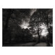 Ein warmes, schwarz-weißes Foto, das an einem sonnigen Novembernachmittag zwischen den Bäumen des Bute Park Cardiff erwischt wird. Die Herbstsonne im Himmel strahlt durch die Bäume aus, die lange Schatten und dramatische Silhouetten ausstrahlen.