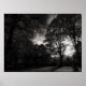 Ein warmes, schwarz-weißes Foto, das an einem sonnigen Novembernachmittag zwischen den Bäumen des Bute Park Cardiff erwischt wird. Die Herbstsonne im Himmel strahlt durch die Bäume aus, die lange Schatten und dramatische Silhouetten ausstrahlen.