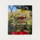 Schöne und traditionelle Gartenlandschaft mit einem roten Schirm, bunten Herbstblättern unter dem blauen Himmel in Koishikawa Korakuen in Tokio, einem der schönsten japanischen Landschaftsgärten.