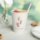 Mit drei festlichen Aquarellfarben-Herbstlauben in lila- und orangefarbenen Tönen, hat diese Tasse einen Platz für Namen, Datum oder anderen Text. Es ist so konzipiert, dass es sich mit der Herbsthochzeit- und Probe-Dinner-Kollektion der Herbstlaub abstimmt, aber auch gut für Herbst-Verlobung oder Jubiläum-Party funktionieren würde.