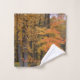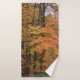 Hübsche Falll-Blätter in Rot-Orange und Golden Gelb in einem Wald von hohen Tulpen-Pappelbäumen und grünen Sträuchern. Der blaue Himmel guckt durch. Glücklicher Herbst, die Schönheit der Natur. Herbstlaube sind in Gelb- und Orangenschrift geschrieben. Original Fotografie © TamiraZDesign.