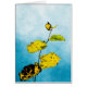 Ein kleiner Pappelbaum-Zweig mit verwitterten und verwitterten Blätter, abgeschieden mit einem blau-weiß strukturierten Hintergrund, der als Himmel dient. Fotografische Malerei.
