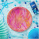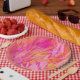 Blätter und botanische Elemente überschneiden sich in Rosa, Orange und Gelb vor einem lebendigen Hintergrund. Die Komposition schafft eine warme, fröhliche und dynamische Atmosphäre.
