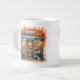 Warmherzige herbstliche Café-Fassade mit lebendigen orangen Blättern, sichtbare Bücher durch das Fenster, Außensessel und eine Katze sitzend am Eingang. Eine charmante saisonale Tasse für Bücherliebhaber, Lehrer, Schüler und Fans der gemütlichen Herbstlektüre-Kultur