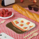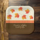 Papier Teller für eine Herbsthochzeit mit farbenfrohen Ahorn-Blätter, kariertem Band und braunem Hintergrund. Eine saisonale Art, Kuchen am Empfang zu servieren. Geben Sie die Namen der Braut und des Bräutigams und das Hochzeitstag ein.