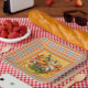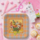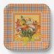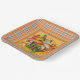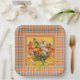 Ein ländlicher Korb voller frischer Pilze in einem orangen Kariert, eine schöne und farbenfrohe Papiertafel für Herbst-Party