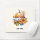 Mouse-Pad mit einem gefallenen Designbild. Orangefarbene und weiße Kürbisse, umgeben von Herbstlauben und orangefarbenen Blume.