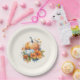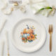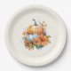 Papier Teller mit einem reduzierten Themenbild. Orangefarbene und weiße Kürbisse, umgeben von Herbstlauben und orangefarbenen Blume.