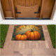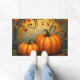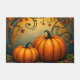 Zwei große Kürbis sitzen auf einer Holzoberfläche. Herbstblätter und verdrehte Zweige umgeben sie und schaffen eine skurrile Herbstszene.