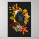 Handbemalte Illustration eines Raben- und Herbstbotanicals-Blätter, Pilze und Beeren