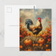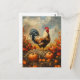 Ein stolzer Herbsthahn, stehend zwischen lebhaften Orangenkürbis und saisonalem Laub.