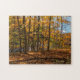 Dieses landschaftliche Puzzle zeigt einen Wald mit Herbstblättern in warmen Farben.