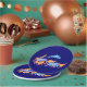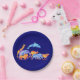 Papier Teller mit einem digitalen Aquarellbild einer Herde wilder Tiere, die zusammen laufen. Zu den Tieren zählen ein springender Delphin, eine Giraffe, Elefant, Känguru, Nashorn, Löwe und Leopard. Der Hintergrund ist eine bläulich lila Farbe.