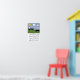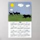 This is a black shadow silhouette of an Australian Shepherd dog driving the sheep. The simple poster is bright and cheerful featuring the dog on green grass, puffy white clouds, blue textured background sky, yellow sun and bird silhouettes flying over head.