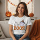 Embrace the playful spirit of Halloween with our "Here For The Boos" t-shirt! This charming design features an adorable ghost dressed in a festive black and orange striped witch's hat, ready to celebrate with a glass of wine in hand. With its whimsical graphics and clever pun, this t-shirt is an ideal choice for those who love a touch of humor in their holiday attire. Step into the season with a smile and let everyone know you're here for the boos!