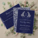 This design features navy blue heritage crest, delicate monogram initials, elegant script typography, a subtle luxury linen texture, with a detailed botanical leaf engraving pattern in silver color. Perfect for classic, royal-themed, old-money, and formal black-tie weddings. This product can be easily personalized. If you need help with the customization of the product or need matching products kindly please contact me via Zazzle.