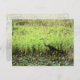 Ein Foto eines Großen Blauen Helden, der durch einen Teich geht. Die Oberfläche des Teiches ist mit Seerosen bedeckt. Der Teich ist von grünen Pflanze umgeben, die an eine Wiese grenzen. Copyright © 2021 Kimberly J Tilley.