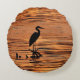 Dieses dekorative, feine, runde Kissen präsentiert einen Großen Blauen Helden (Ardea herodias) in der Silhouette, Angeln in den flachen Gewässern des Cayuga Lake in Ithaca, NY, die eine der Finger Seen von upstate New York. Ein wunderschöner Sonnenuntergang in Orange, Gelb und Gold färbt die Wellen und Wellen in einem abstrakten Muster.