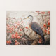 A heron stands in shallow water surrounded by vivid red autumn foliage. The artwork captures a tranquil moment in nature with painterly brushwork.