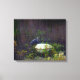 Ein Foto eines Großen Blauen Helden, der einen Teich zum füttre auf Beute streift. Bei einem Schritt bewegen sich die Äpfel über die Wasseroberfläche. Der Vogel steht neben einem Felsbrocken, der für eine Fische oder Schlange gewartet ist. Verschiedene aquatische Pflanze bilden auffallende und verschlungene Linien, während sie aus dem Wasser aufwachsen. Image Copyright ©2021 Kimberly J Tilley.