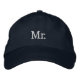 Dieser Mr. Cap wird in Navy mit weißem besticktem Text gezeigt. Passen Sie dieses Objekt an oder kaufen Sie, wie es ist.