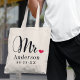 Personalisierte Mr. tote Tasche für den neu verheirateten Bräutigam mit elegantem, modernem, schwarzem Drehbuch und klassischem Familienname und Hochzeitstermin-Monogramm-Text, der personalisiert werden kann. Das Design umfasst ein niedliches, rotes Herzstück. Ein tolles Hochzeitsgeschenk für die Flitterwochen! Laden Sie unser Geschäft für die koordinierende Frau Tasche Design.