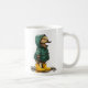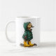 Tasse mit niedlicher Ente in Gummi Stiefeln und Regenmantel in Pfütze