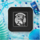 Schwarz-Weiß-Porträt eines kleinen Schnauzers mit Gläsern auf einem Sonnenuntergang im Vintagen Stil. Das perfekte Geschenk für Schnauzer-Liebhaber.