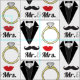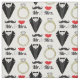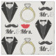 Adorable Hochzeitsmotiv Stoff zum Feiern der Nuptialzeremonie des schönen Paares. Das Design besticht durch modernes schwarzes Tuxedo, elegante Gold- und Diamantenring-Band, schwarzen handlebar Schnurrbart und roten lips Kuss, sowie die Worte Mister und Misses, die Braut und Bräutigam feiern. Erstellen Sie mit diesem lustigen Brautparty-Thema individuelle Hochzeitsfavoriten für den Empfang.