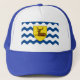 Hut mit Design mit einer Fahne des historischen Landkreises von Hertfordshire, in England, Großbritannien; Fahne mit einer Darstellung eines Stages in einem gelben Schild auf weißem und blauem, gewelltem Hintergrund