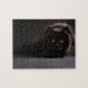 Schwarze Katze gefangen genau im Moment des Herumstreichens. Er ist mit seiner schwarzen Silhouette schön, die heraus vom dunklen Hintergrund späht.