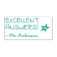 Dieses ermutigende Design der Gummi-Briefmarke beinhaltet die motivierend Feedback-Nachricht "EXCELLENT ANSWERS!" und einen eigenen Lehrernamen. Es hat auch eine dekorative Sternform. Es könnte von einem Lehrer oder Erzieher bei der Bewertung der Arbeit eines Schülers genutzt werden, um anzuerkennen, dass ein Schüler eine außergewöhnliche Arbeit geleistet hat.