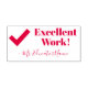 Dieses motivierende Gummi Briefmarke Design beinhaltet die inspirierend Feedback-Nachricht "Excellent Work!" und einen personalisierten Tutor-Namen. Es verfügt auch über ein dekoratives Karo-Symbol. Es könnte von einem Lehrer, Pädagogen, Ausbildern oder Tutor genutzt werden, um anzuerkennen, dass ein Schüler eine außergewöhnliche Arbeit geleistet hat.